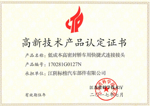 日前,我司低成本高密封轎車用快捷式連接接頭獲江蘇省科學(xué)技術(shù)廳頒發(fā)的高新技術(shù)產(chǎn)品認(rèn)定證書。